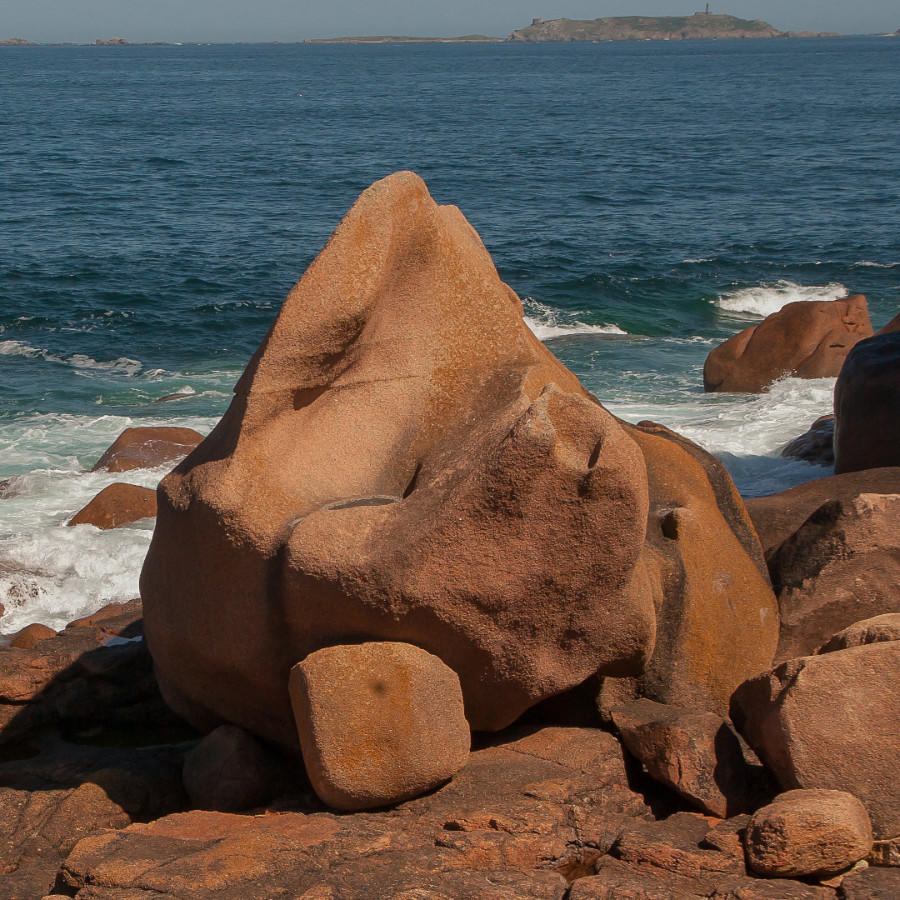 Ein großer, rötlicher Granitblock steht an einer Felsenküste in der Brandung.