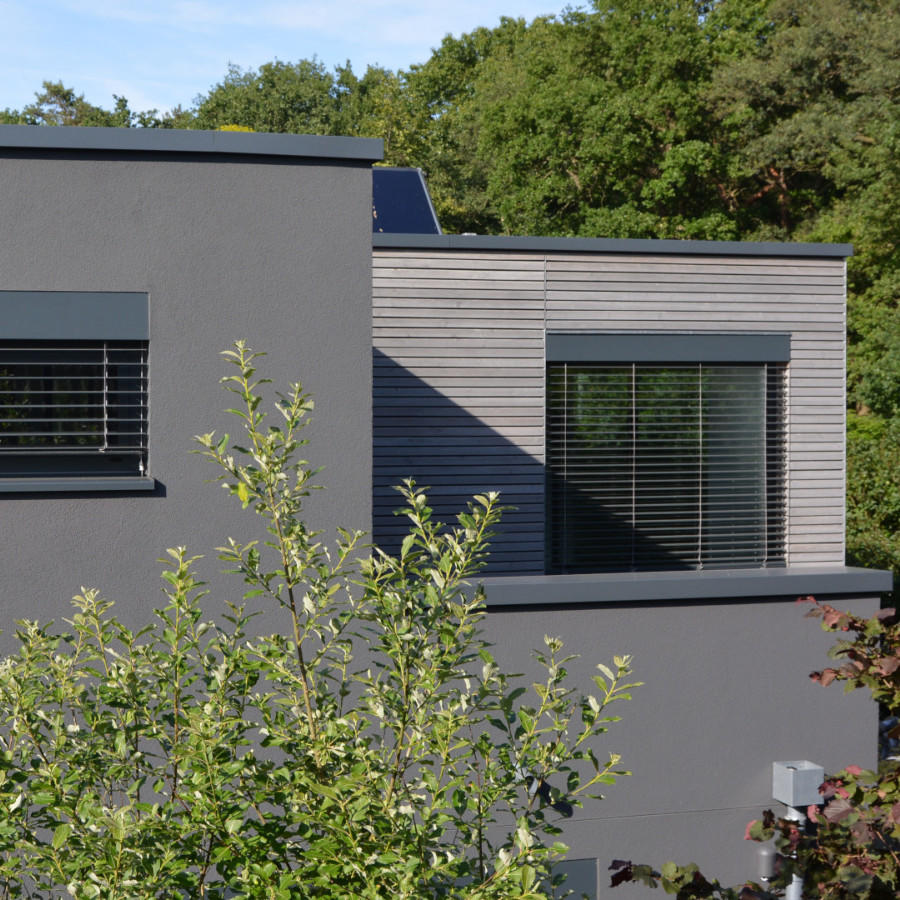 Ein modernes Haus mit Außenfensterbänken und Mauerbrüstungen aus schwarzem Aluminium.
