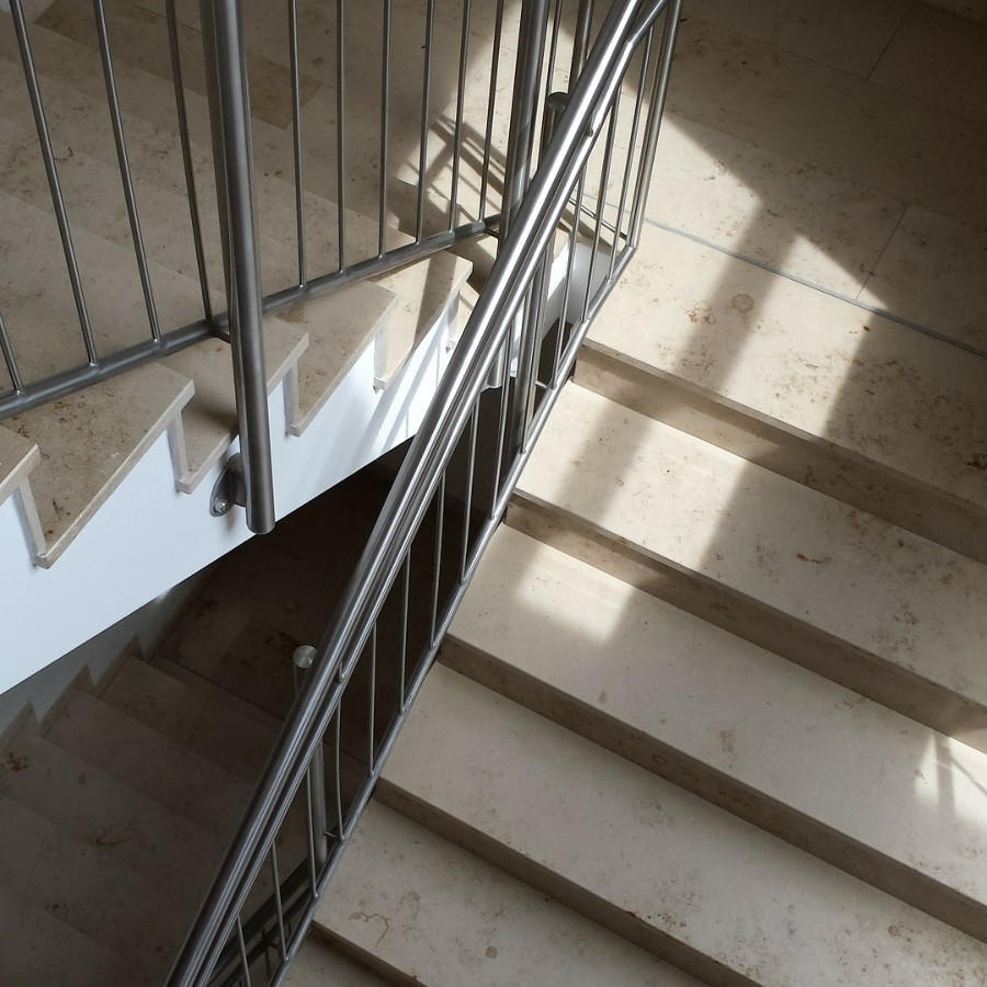 Unsere Aluminium-Fensterbänke Eine Treppe mit beigefarbenen, marmorierten Treppenstufen.