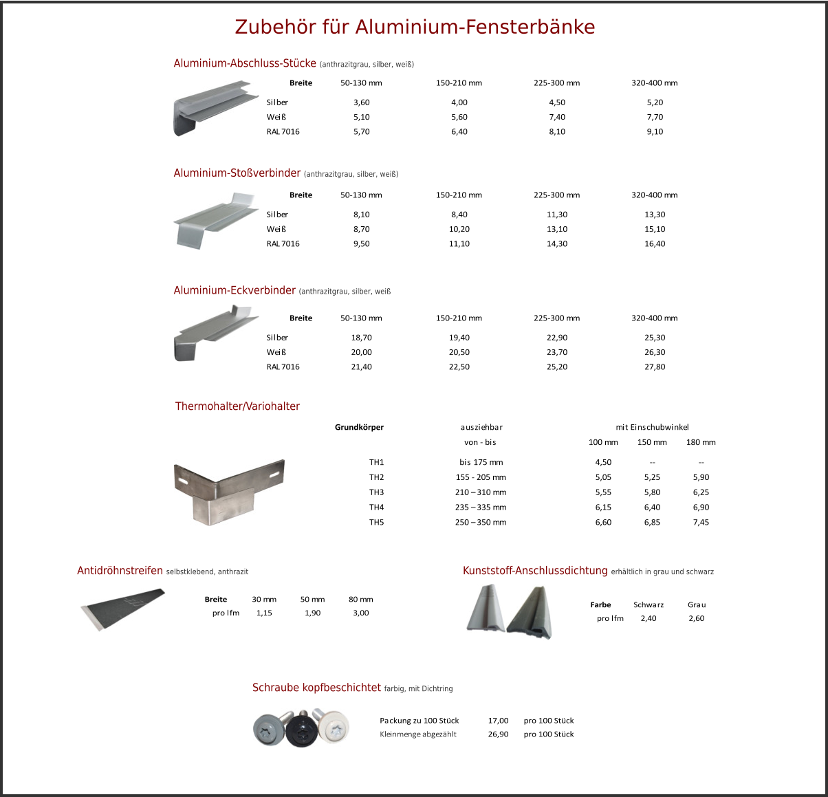 Farbe eloxiert oder beschichtet. Die kurzen Seiten der Fensterbank (Köpfe) werden mit einem Endstück aus Aluminium abgedeckt. Die Aluminium-Bänke