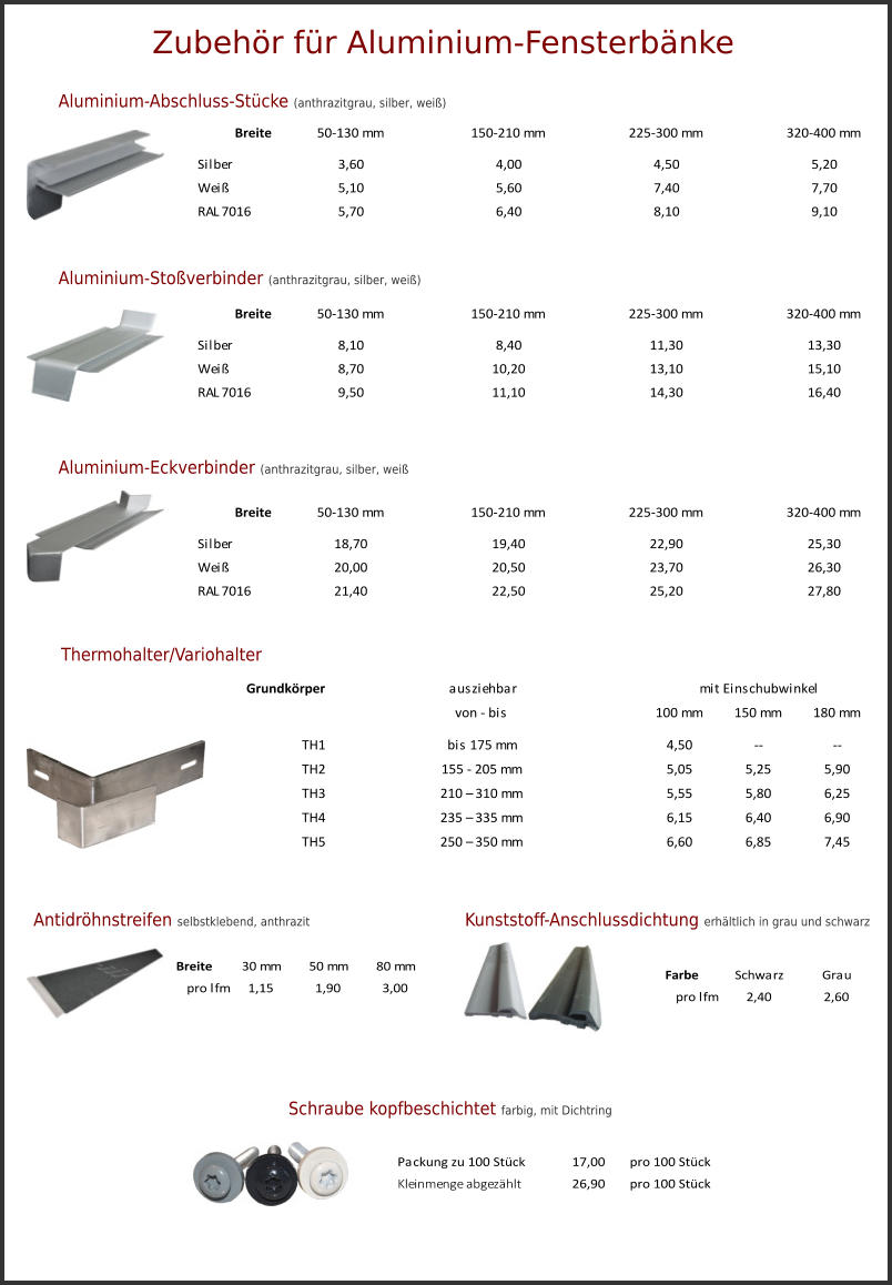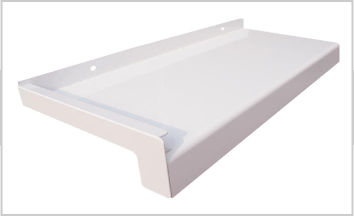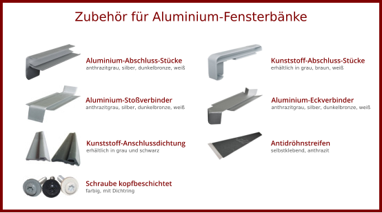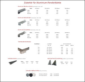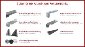 Farbe eloxiert oder beschichtet. Die kurzen Seiten der Fensterbank (Köpfe) werden mit einem Endstück aus Aluminium abgedeckt. Die Aluminium-Bänke